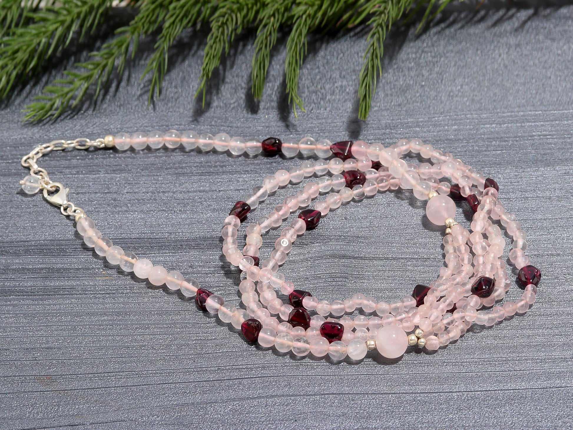 Elegant women’s gemstone necklace, combining the soft pink of Rose Quartz with the purple hues of Amethyst.