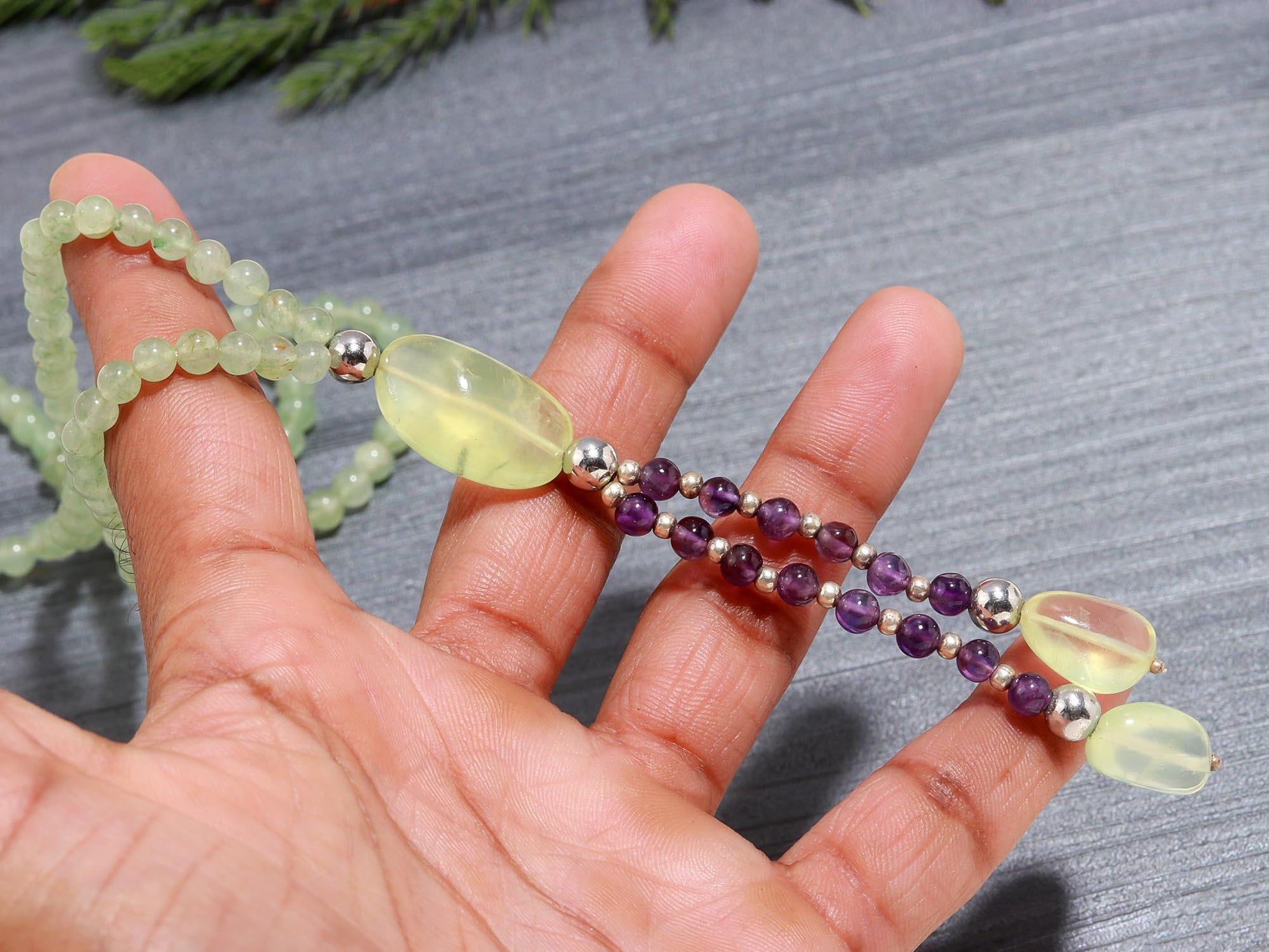 Made with genuine Amethyst and Prehnite gemstones set in 925 sterling silver for a natural, elegant look.