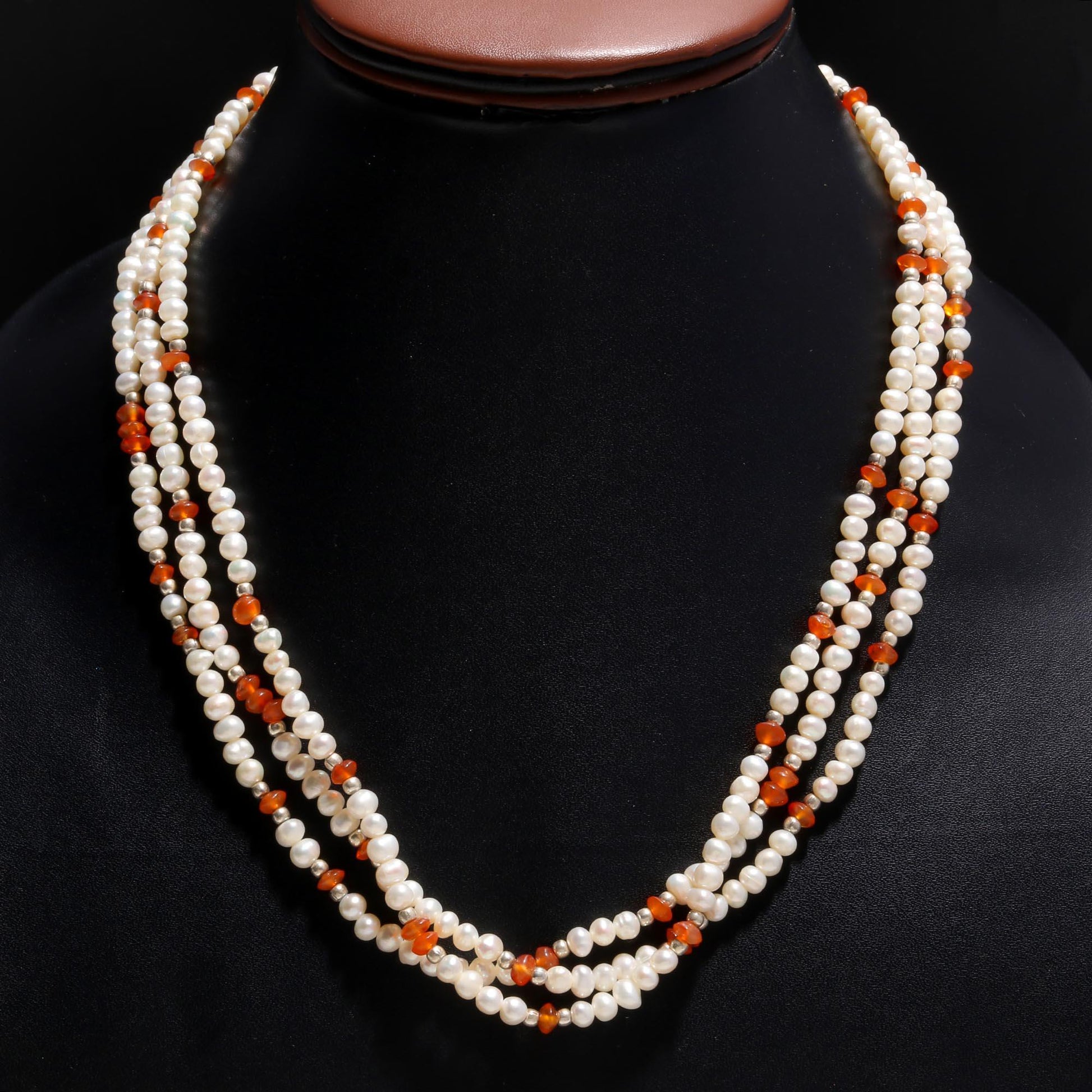 Make a sophisticated statement with this gorgeous Triple Strand Freshwater Pearl and Carnelian Necklace. This luxurious piece beautifully combines the classic elegance of genuine, lustrous Freshwater Pearls with the warm, vibrant energy of natural Carnelian gemstones (known for vitality and confidence).