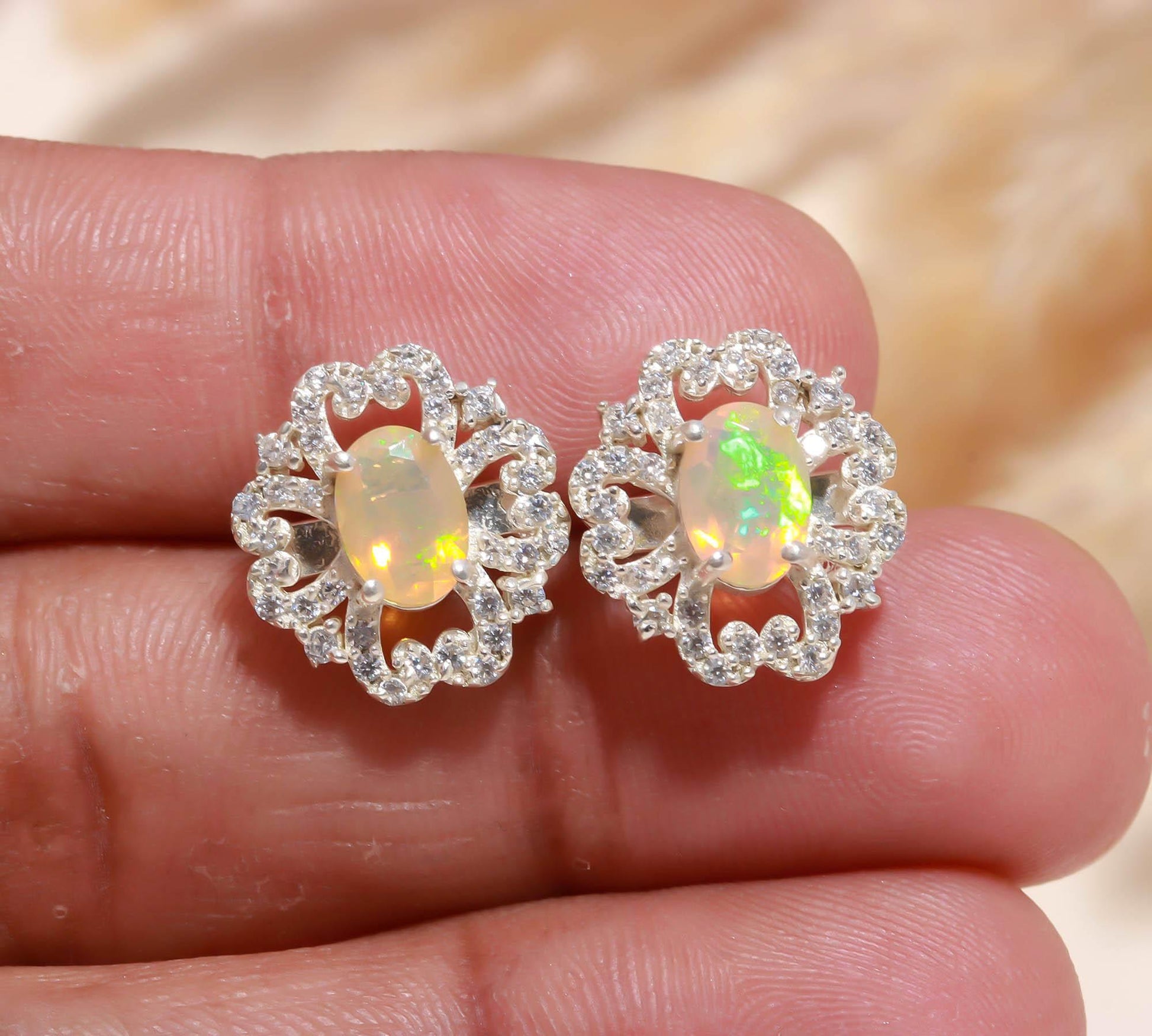 Gemstones: Genuine Ethiopian Opal paired with sparkling White Zircon for a radiant, eye-catching contrast.